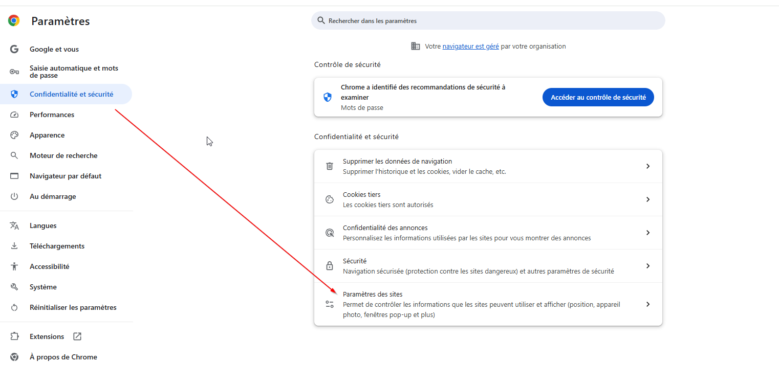 - Puis, aller dans Confidentialité et sécurité (l’icône de verrou ou de bouclier) et cliquer sur la ligne clic-till.com